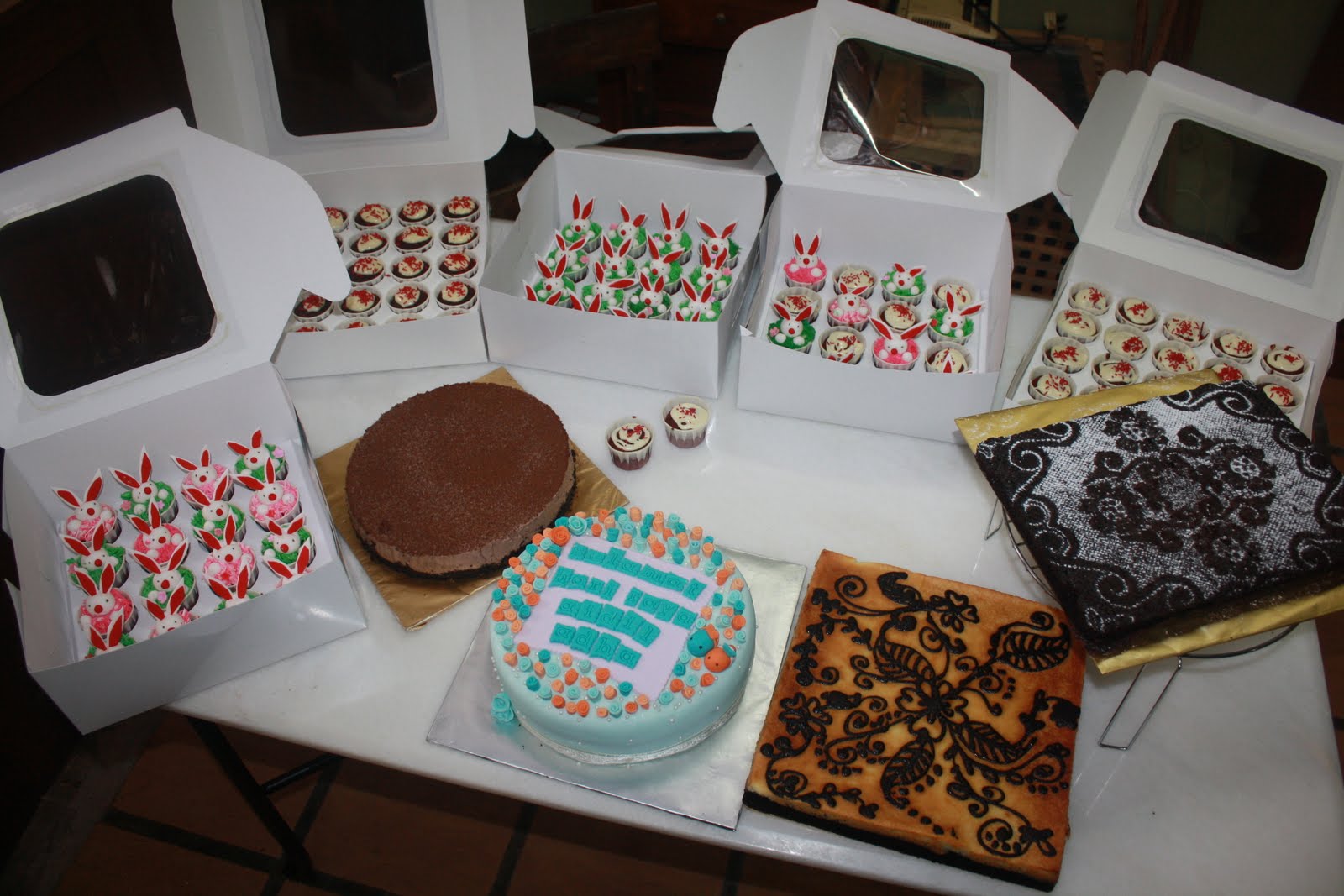 Five different types of cakes , from oreo chocolate cheesecake, to marble cheese brownies, brownies with walnut, rainbow cake ( with the orange and turqoise deco ), and the " rabbits in the hole" red velvet cupcakes , for raya.thank you Za, it's a pleasure making these for you and hope you enjoy the cakes......